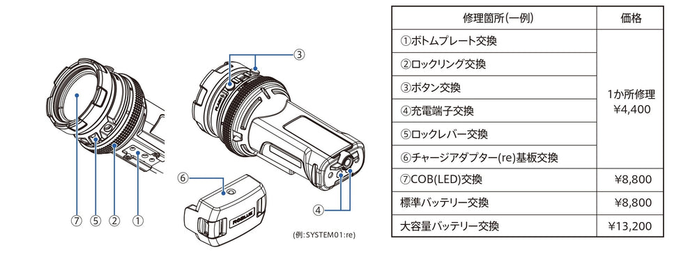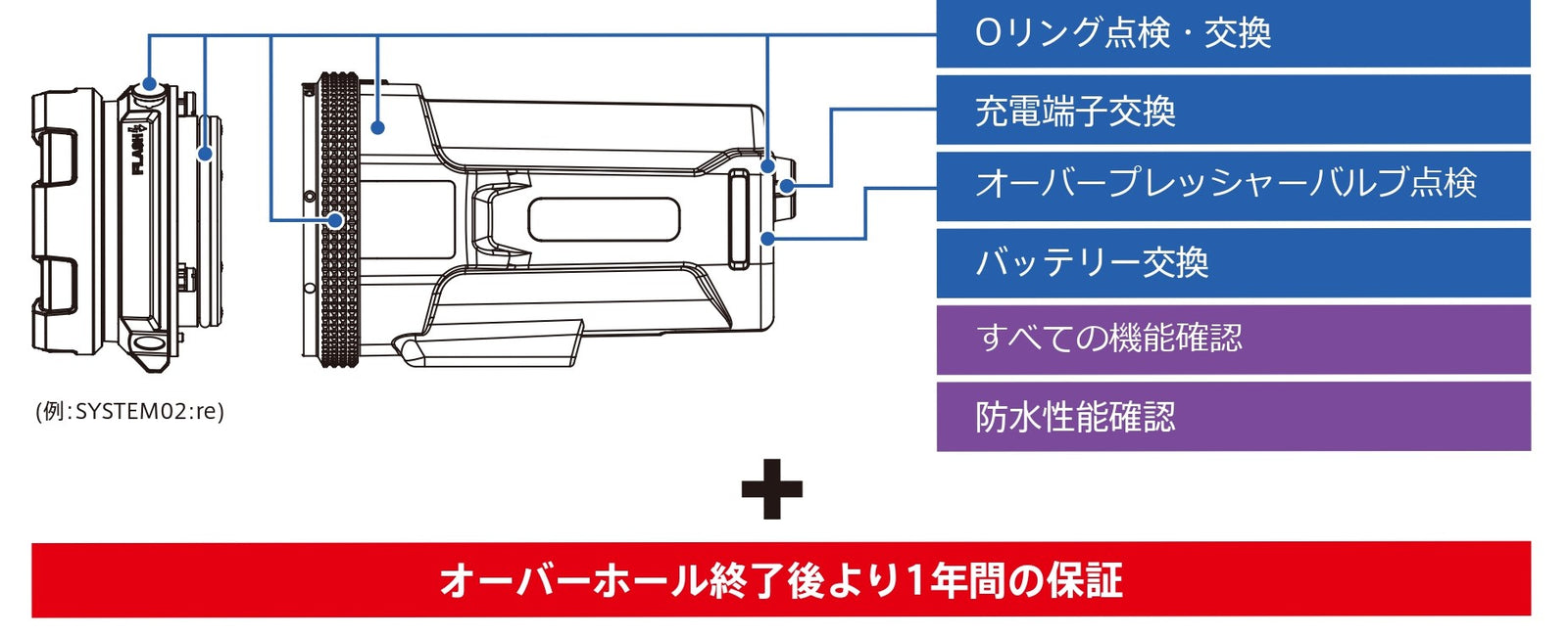 We will inspect and replace the main O-ring and internal O-ring, replace the charging terminal, inspect the overpressure valve, replace the battery, and check all functions and waterproof performance.